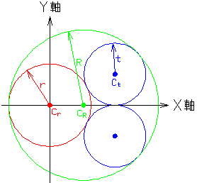 大・・・中心CR(p,0),半径R 中・・・中心Cr(0,0), 半径r 小・・・中心Ct(√{(r+t)2-t2}, t),半径t