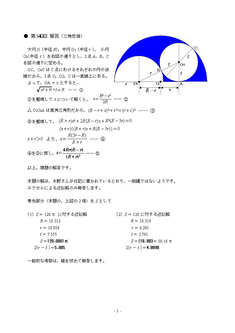 あけましておめでとうございます。本年もよろしくお願いします。第149回の解答を送ります。新年から難問ですね。なかなか時間が取り難く、また前回同様少し根気がなくなっているようで、取りあえず送ってしまえという感じです。(もっとうまい方法もありそうだな、計算間違いもありそうだなetc,etc)大目に見て頂ければ幸いです。
