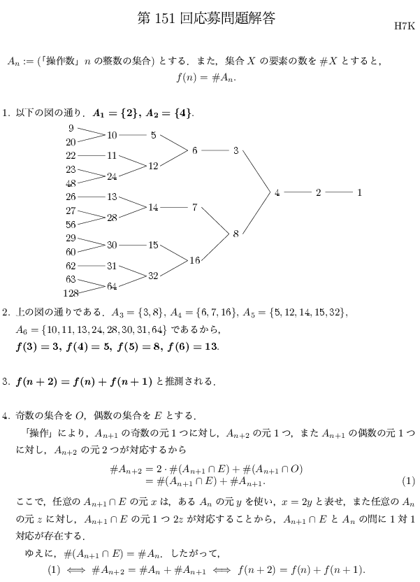 さて、今回の問題ですが、『記憶にある数列』になると書いていましたので、フィボナッチ数列かなぁと予想しながら問題に取り組みました。少々強引に証明した