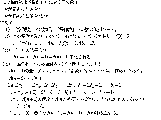 問3. f(n+2)=f(n+1)+f(n) と予想される。