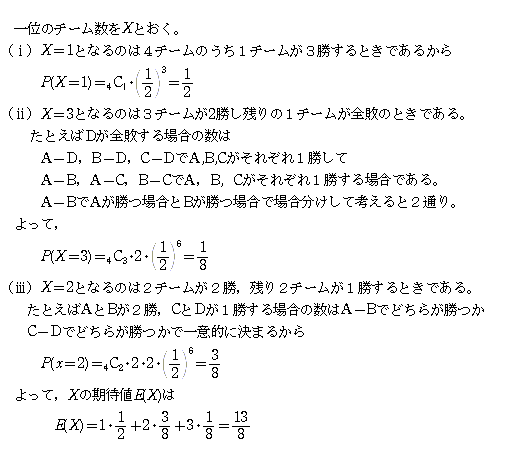 エクセルのマクロを使い,すべての場合の勝ち負けを表示します.条件から,すべて同程度に起きると考えられるので,そのまま1位のチーム数の平均を計算します.答は13/8です.