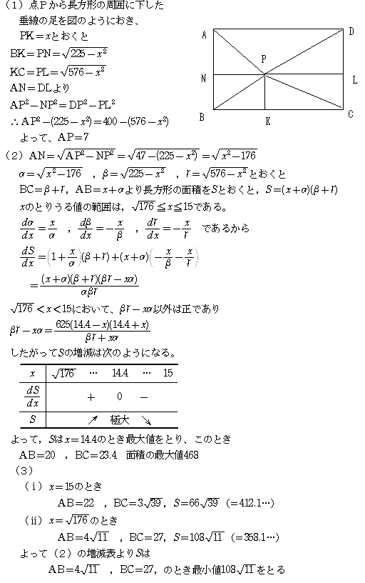 更に点Pが対角線AC上にある場合をかんがえる。今∠CADをθとして4個の三角形各々に余弦第2定理を適用し、aとbを求めると、夫々√(10881/17)と√(5456/17)となる。因って長方形ABCDの面積は372√429/17となる。