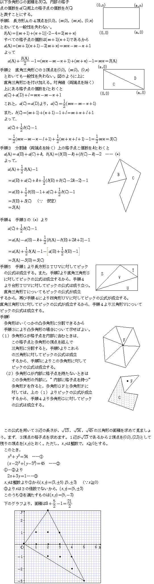 点順6:格子点を結んでできる一般の多角形のとき、ピックの公式を証明せよ。(文章表現になる)