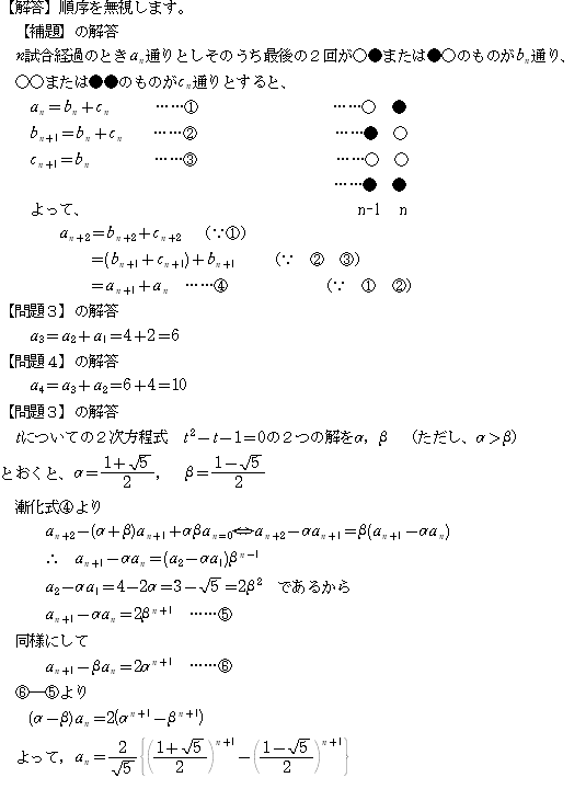 問題1、2と同様に、(n-2試合経過のものにn-2試合目と逆のもの2つつけたもの)と(n-1試合経過のものにn-1試合目と逆のもの1つつけたもの)の和と考えれば、