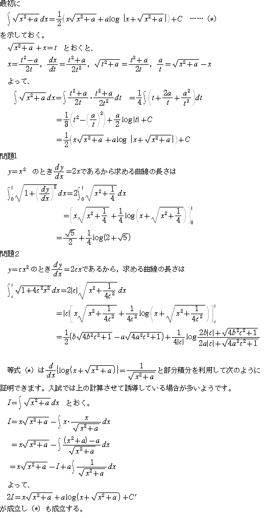 ですが、公式∫√(x2+α)dx=[x√(x2+α)+αlog{x+√(x2+α)}]/2+C(=定数)を利用すると、