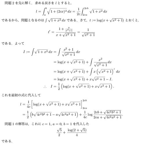 ∴2L=51/2+1/2・∫(0≦t≦2)1/(1+t2)1/2・{t+(1+t2)1/2}/{t+(1+t2)1/2}・dt