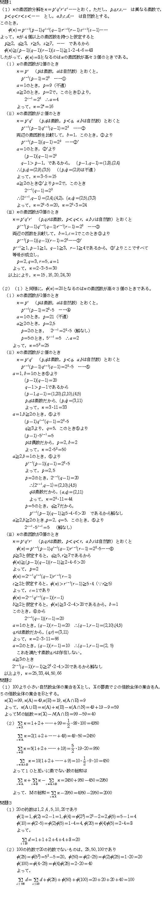 問題1 (1)φ(n)=8を満たす自然数nを求めよ。
