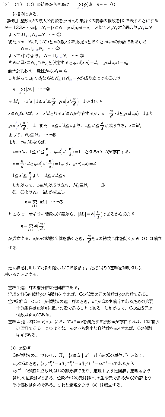 3)1≦k≦n の自然数k とnとの最大公約数は、nの約数のいずれかであるから、1〜n