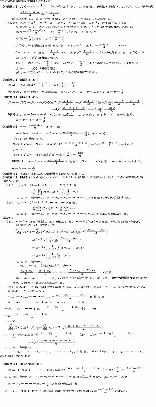 定理A: [0,∞)でf''>0のとき,正数a_1, a_2,..., a_nについて,f((a_1+...+a_n)/n) <= ( f(a_1)+f(a_2)+...+f(a_n)