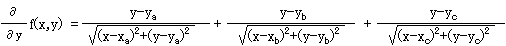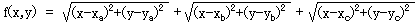 三角形の頂点をA(xa,ya)、B(xb,yb)、C(xc,yc)、内点P(x,y)をとすると、線分AP、BP、CPの和f(x,y)は