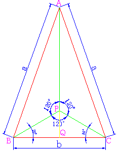 ここで、左図のような二等辺三角形を考えます。すると、AP+BP+CPの長さが最小になる点は図に示した点Pで、そのときの最小値は、
