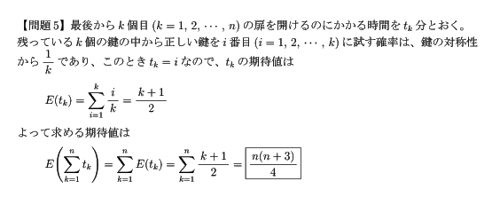 最初、n個の扉があってk分かかる確率の分布を求めようとして、漸化式作ったりしても、一般式 うーん?という感じでしたが、問題1〜4のおかげで、期待値だけならば確率分布が対称型なのでまん中をとればよいということに気づきました。数学においても、(特に整数論などでは)頭の中で考えるだけではなくて、「実験が大切」と何かで読んだことがありますが、あらためて「その通り」と一人で納得しておりました。