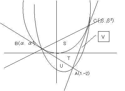 まず、二つの接点 B(α,α^2), C(β,β^2) を通る直線を求めておきます。これは、α not= β なので、
