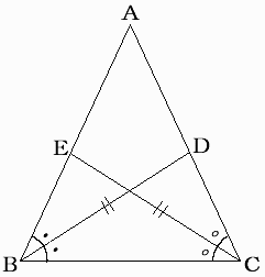 三角形の二つの角のそれぞれの二等分線を引き、それぞれの線が対辺に交わる点までの長さが等しいとする。 (図のBD=CE)