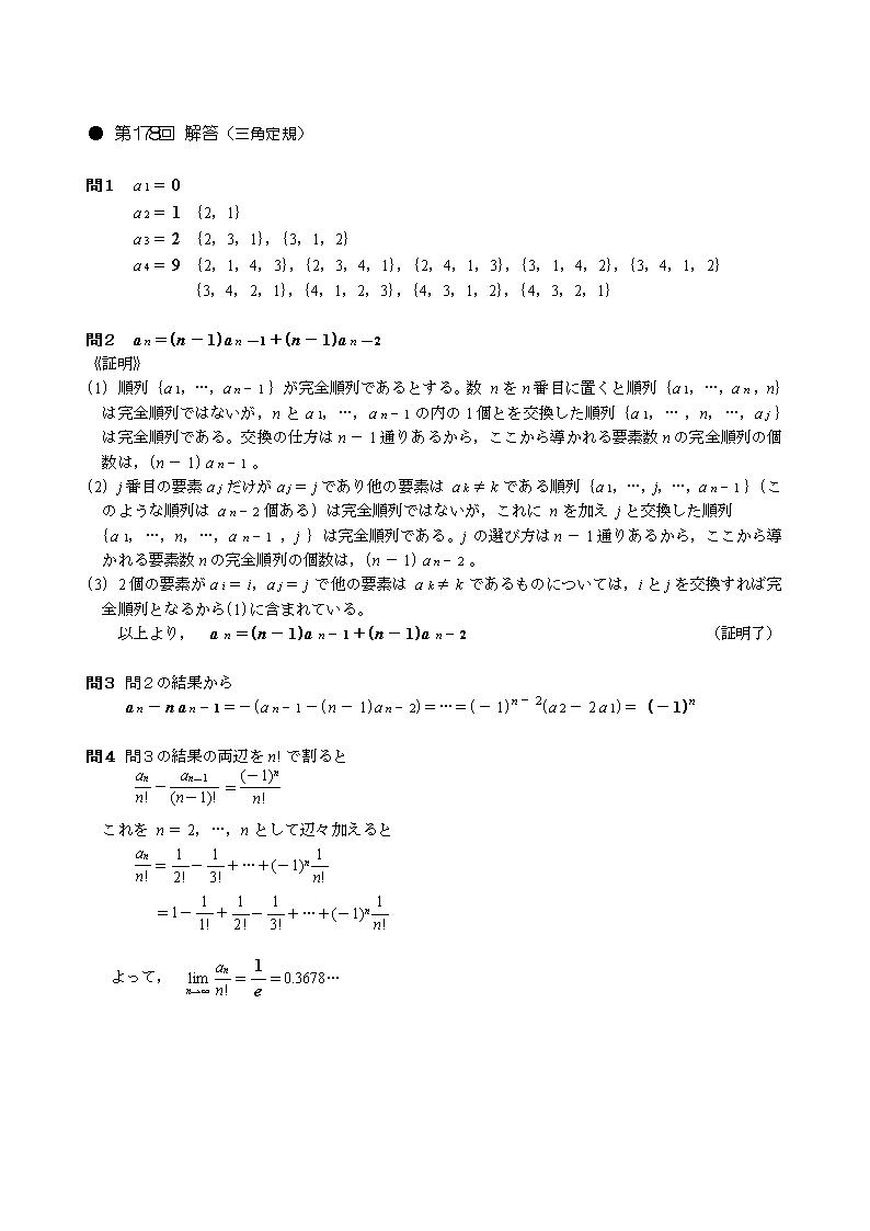 <コメント:今回は完全順列の問題ですね。設問通りにやっていくと、うまく確率に辿り着けますが、極限値が0ではなく、ある値(1/e)に収束するところが興味深いですね。>