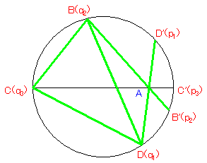 下図のような六角形D',D,B',B,C',Cに対して、複素平面の単位円上の点p1,q1,p2,q2,p3,q3を割り当てます。