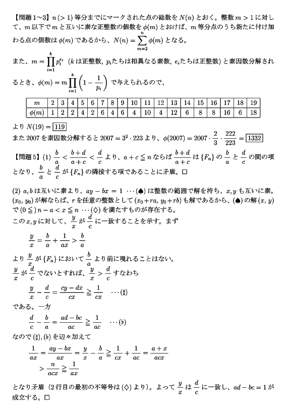 問題2 上の表を見てわかる通り、線分の2,3,4,…,n等分点にマークをつけたとき、新たに増えるマークの個数は、2,3,4,…,nと互いに素な数の個数です。よく知られているように、この数はオイラー関数φ(n)で表されます。つまり、2007=32・223なので、 |