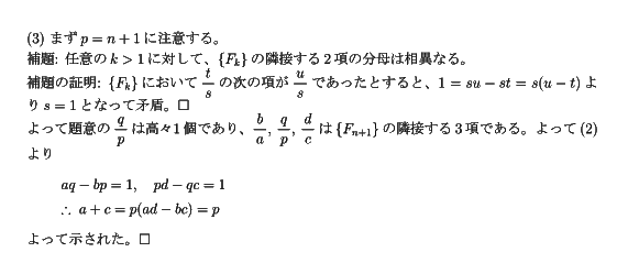 (1) a+c≦nならばb+d<nなので(b+d)/(a+c)が{Fn}に含まれることになってb/aとd/cが