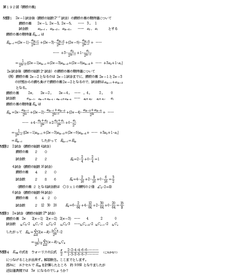 問題3:2n試合終了したときの期待値E2nをnで表せ。ただし、組み合わせの記号Cを用いても良い。