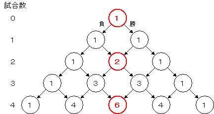 とする。ここで更に1試合行うと、確率1/2で勝つか負けることになり、1試合増加することにより勝敗の差は+1か-1となる。