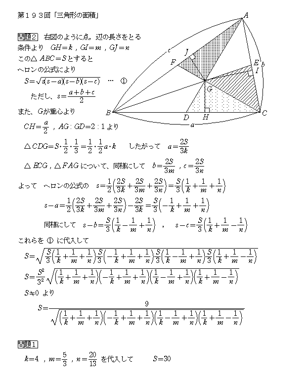 <コメント>今回の問題も非常に興味深く解かせて頂きました。 三角形の面積がこんな風に表せるとは正に目から鱗です。>