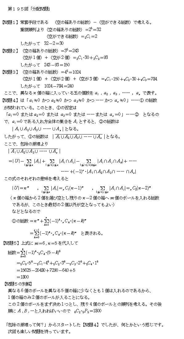 以外に易しいなと思い、どんな風に解いているのかとヒントを見てみました。 正にがーんと頭を殴られました。そうです、区別のつかない球の計算をして いたのです。 そこで一念発起、再度取り組みました。但し、問4にはてこずりました。包除