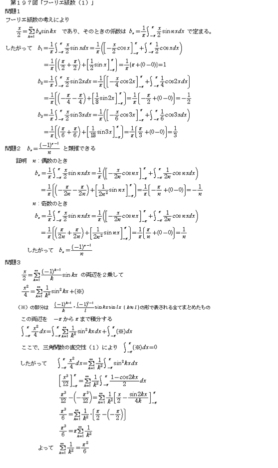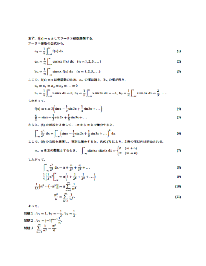 <コメント:小職の大好きであ ったフーリエ級数の問題で、学生時代を懐かしみながら解かせて頂きました。 少々簡略説明ですが・・・>
