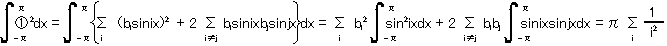 = Σ[m=1,∞ & n=1,∞] {(-1)^(m-1)/m * (-1)^(n-1)/n * ∫[-π〜π] sin(mx)sin(nx)