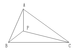 三角形ABCがある。この内部に点Pをとって、点Pと3つの頂点A,B,Cを図のように結びます。
