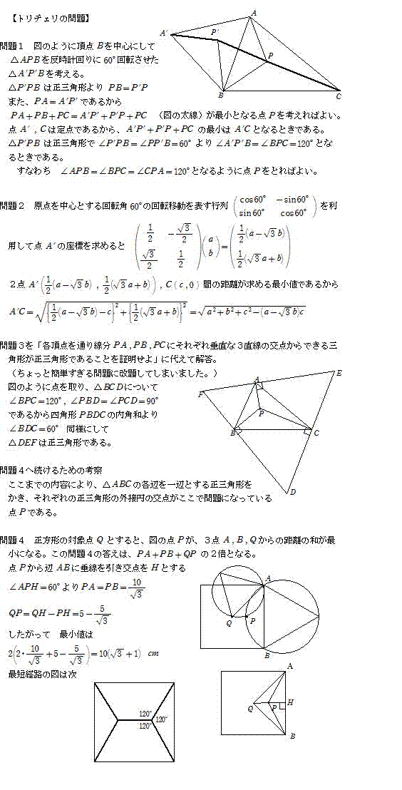「三角形の各頂点からの和が最小になる点を求めよ」という問題を出したことがあり、
