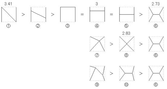 @>A>B=C=D,F>Gは明らか.H>Iは,反射の原理より高さ1/2の位置に中継点をとった場合に頂点からの距離の和が最小になり,中継点間の距離も水平の方が小さいことより示される.