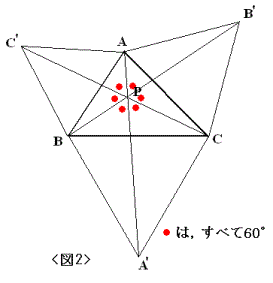具体的には,点A’をBCについてAと反対側に △A’CB が正三角形になるようにとる。同様に,点B’をCAについてBと反対側に △B’CA が正三角形になるように,点C’をABについてCと反対側に △C’BA が正三角形になるようにとる。3線分AA’,BB’,