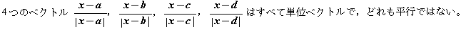 平行でない4つの単位ベクトルの和が0となるのは,4つが,正四面体の重心(中心)から4頂点に向かう