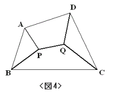 平面上の四辺形ABCD内に2点P,Qをとり,4点に至る距離の和 |