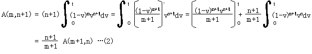 A(m,n+1) = m * ∫[0<=t<=1]{t^(m-1) * (1-t))^(n+1)}dt