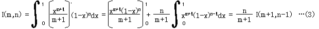 = [x^(m+1)/(m+1) * (1-x)^n][x=0,1] - ∫[0<=x<=1]{x^(m+1)/(m+1) * n *