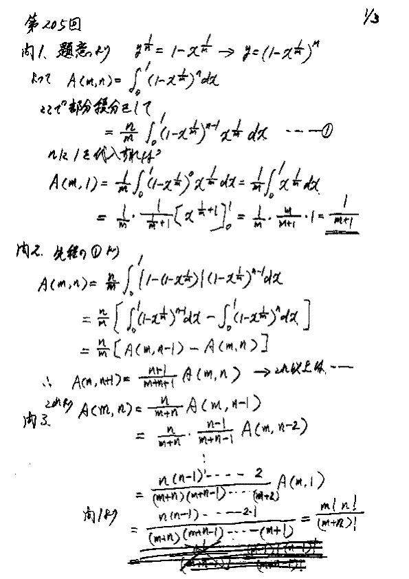 問1 y=1-x^(1/m)を区間[0,1]で積分して、1/(m+1)