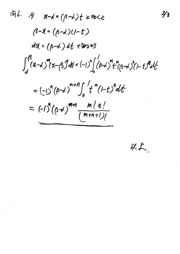 <コメント:今回の問題も数V微積を思い出しながら楽しく解かせていただきました。問3の解答の綺麗さに感動しましたが、部分積分を単調に繰り返してしまい、エレガントな解答からは離れてしまいました。特に問6は問5の利用が ・・・ と思いましたが」断念!! 皆さんの解答で勉強します。