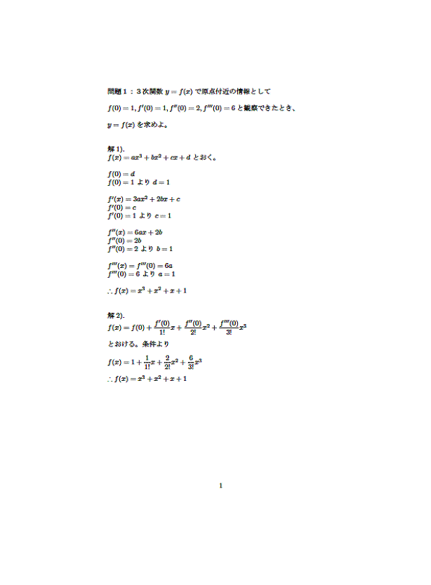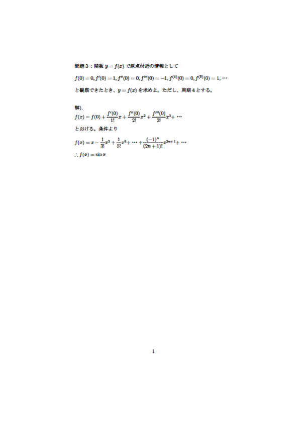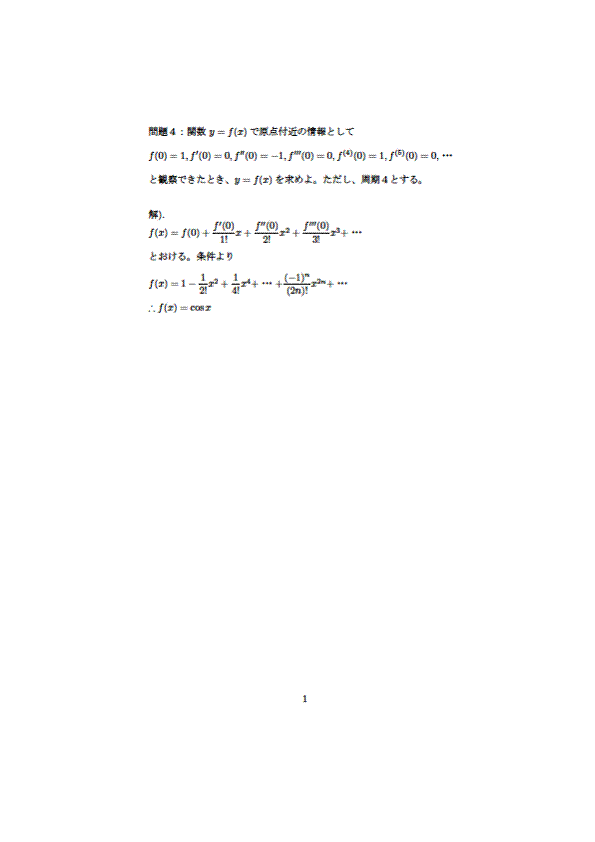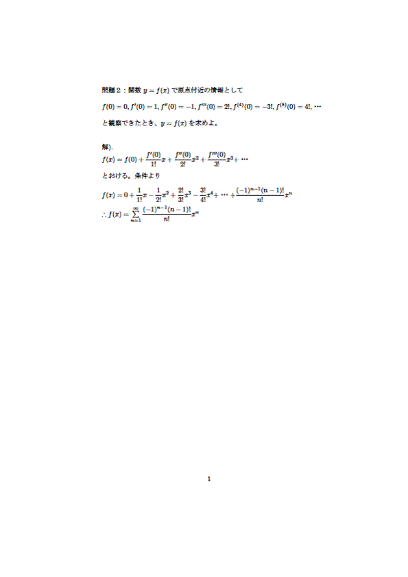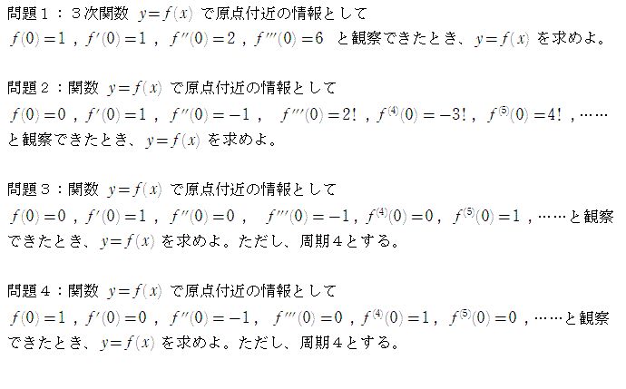 皆さん、ある関数について、原点にあるいろいろな情報を読み取るだけでその関数を決定できることをご存知ですか。その情報とは原点におけるy座標、第1次導関数の微分係数、第2次導関数の微分係数、第3次導関数の微分係数、・・・、第n次導関数の微分係数のことです。では問題です。