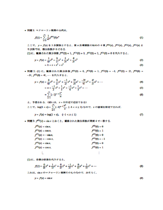 <コメント:今回はマクローリン展開の問題ですね。プログラムで扱う三角関数や対数関数などはマクローリン展開を使った近似式で、私たちプログラマーには馴染みの深いものです。しかし、その数学的な論理はほとんど意識することはありませんから、今回はいろいろと調べてみるいい機会になりました。