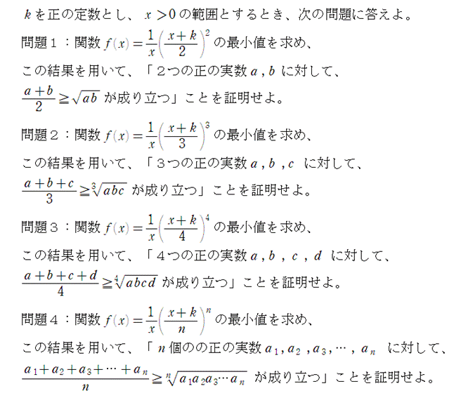 皆さん、教科書傍用問題集(数研出版)を見ていたら、相加平均・相乗平均の証明問題がでていました。