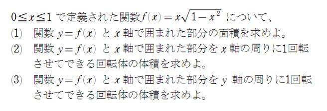皆さん。バームクーヘン積分をご存知ですか。ある図形をy軸の周りに回転させてできる回転体の体積を求めるのに便利な公式です。ここで、今年の滋賀県立大学前期の問題を一部か改題して紹介します。