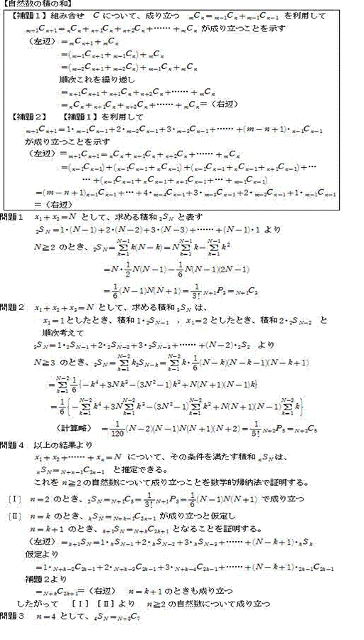 問題4:一般にx1+x2+・・・+xn=N(x1,x2,・・・,xnは自然数で、Nはn以上の自然数)となる自然数の組(x1,x2,・・・,xn)はnHN−n通りある。これらの組のそれぞれについて積x1x2・・・・xnを考え、このようにしてできたnHN−n個の数をすべて加えるといくつになるか。