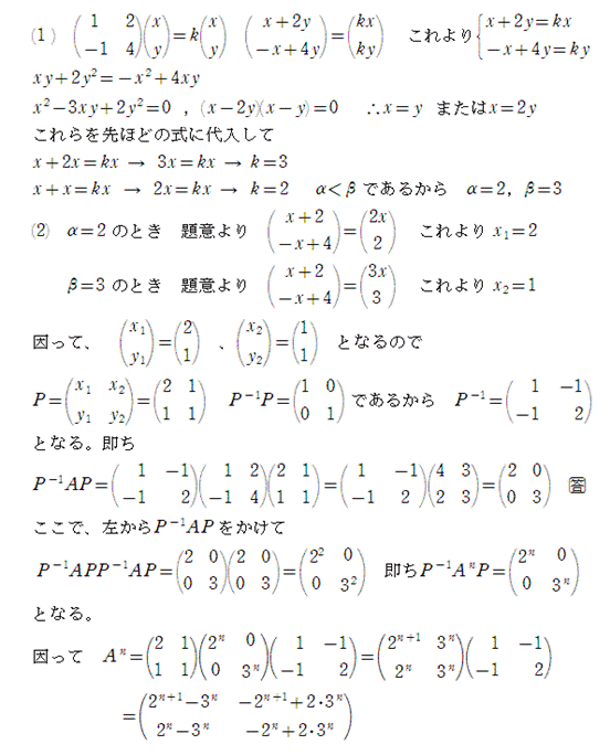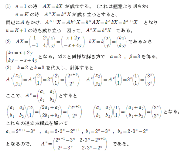 <コメント:今回の問題には驚かされました。小職が高校生の頃は行列など 無く、大学1年の教養で初めてお目にかかり、色々な問題を解かされたことを思い出し たからです。 しかも、この様に色々な解き方で・・・・、やはり時代は着実に進歩しているのですね。>