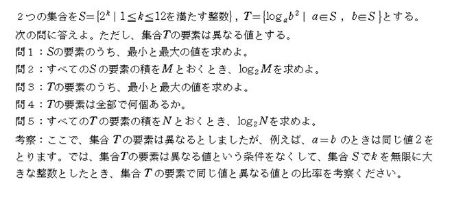 まず、意図ですが、1≦k≦12のとき、但し書きの条件がなければ、集合Tの要素の中には同じ値がでてきます。そこで、集合Tのすべての要素の個数は、すなわち144個ですが、条件をつけた場合のとりうる値の個数は問4の答えですが、その2つの割合をkを無限大にして考察ください。(全体との比率に変えました) 皆様にご迷惑をおかけしたことを深くお詫びします。