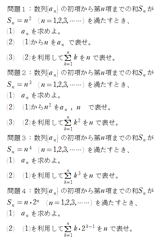 先日、「大学への数学8月号」を読んでいたところ、累乗和の求め方の記事があり、今までと違った方法でしたので、紹介を兼ねて出題します。