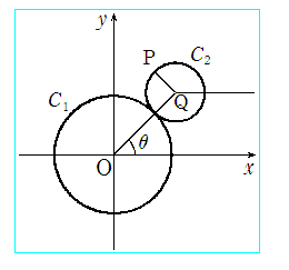 座標平面上に原点Oを中心とする半径2の円C1がある。半径1の円C2がC1に外接しながら滑ることなく転がるとき、C2上の定点Pが描く曲線について考える。C2の中心をQとし、Qが点(3,0)にあるとき、Pは点(4,0)にあるとする。このとき、x軸の正の方向から線分OQへ測った角をθとして次の問いに答えよ。