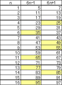 nの値に応じた表を作成すると確かに素数はこの2タイプで表される。但し、黄色で塗りつ