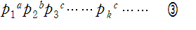 の形で、指数a,b,・・・,cは、正整数のあらゆる組み合わせをとる。整数の素因数分解の一意性によって、Bにはすべての自然数がもれなく重複なく現れるので、Aは