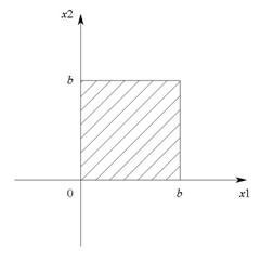 0≦x1≦bかつ0≦x2≦bなので,(x1, x2)のとり得る領域をx1-x2 直交座標系に図示すると,図3に斜線で示した正方形の内部(及び境界上)になり,(x1, x2)